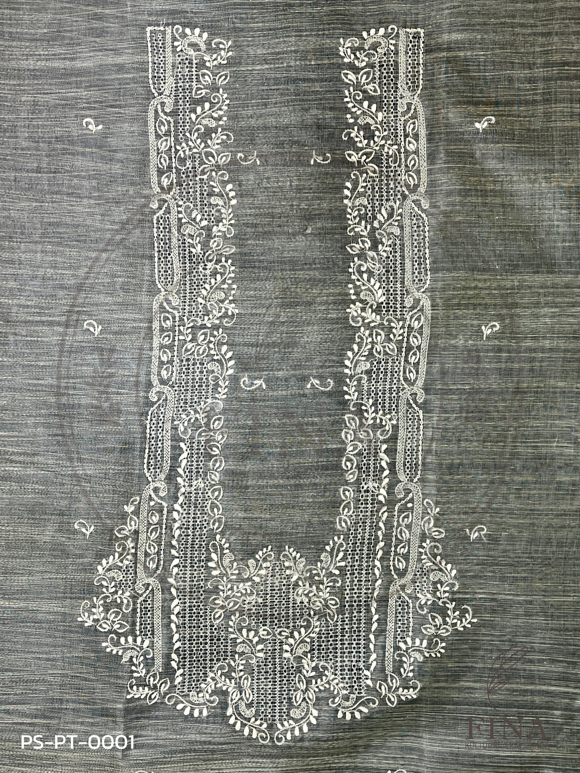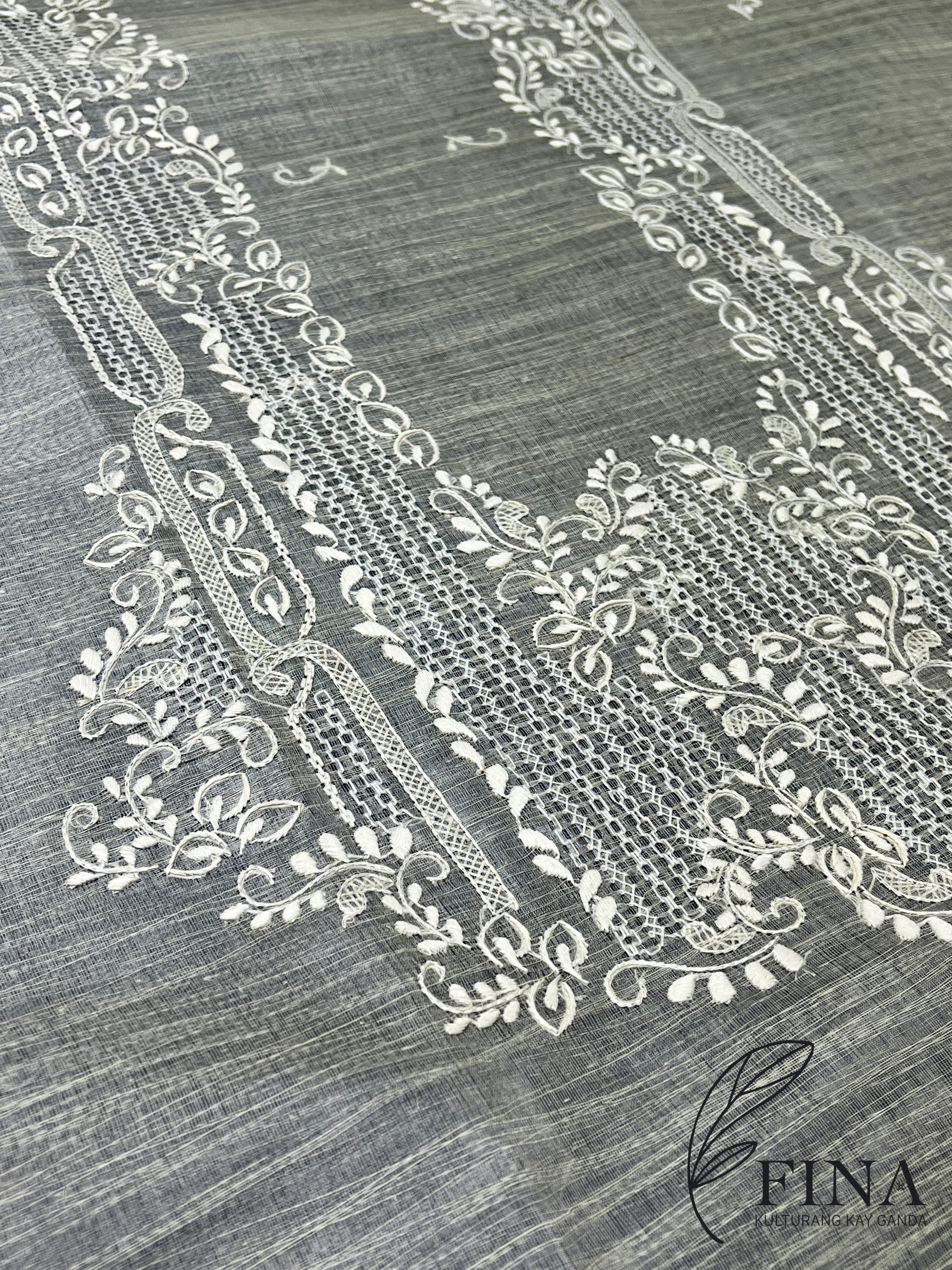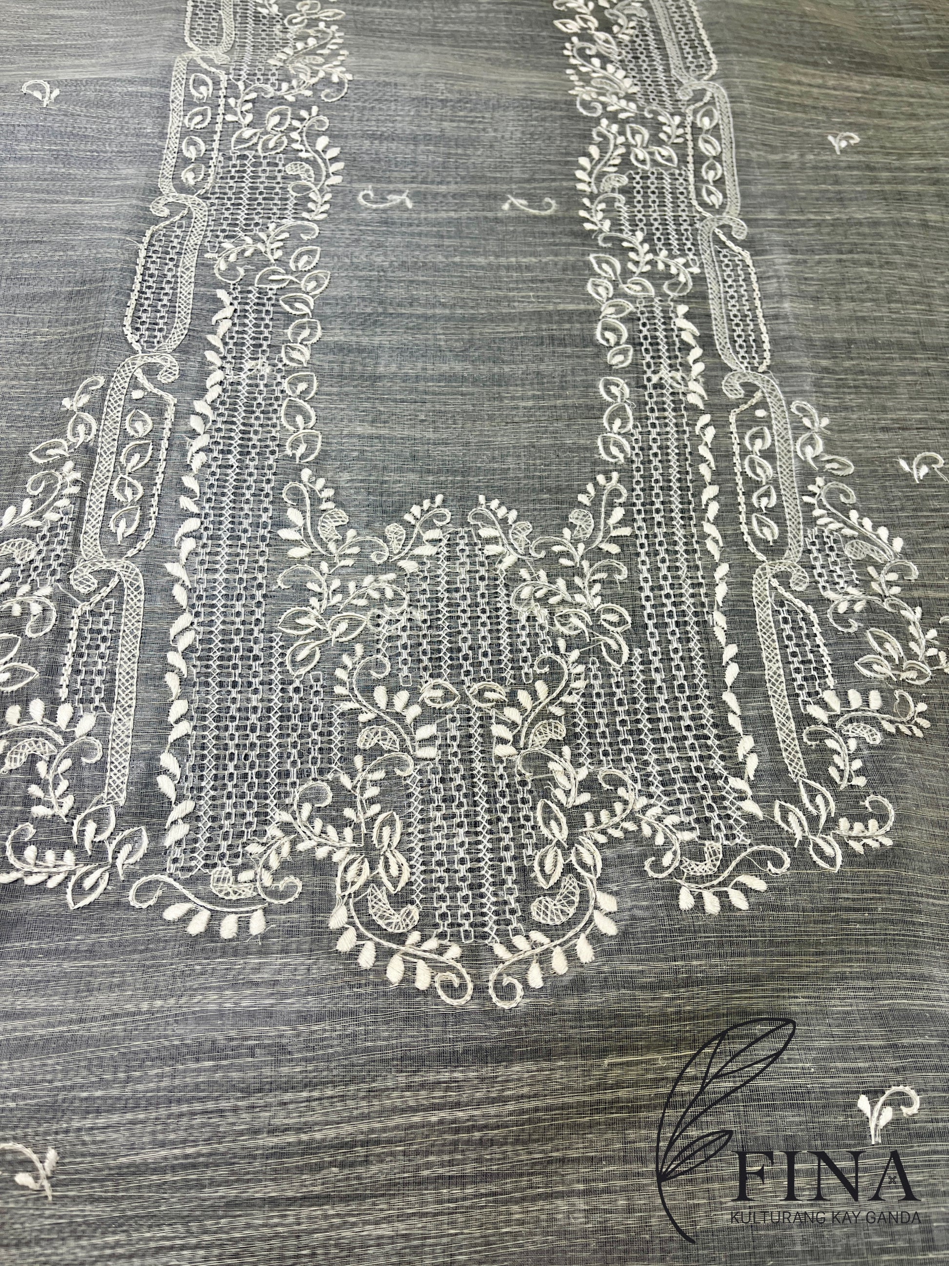 A refined piña-silk fabric panel featuring intricate hand embroidery in a traditional U-shaped pattern. Perfect for Barong Tagalog, this piece showcases the timeless elegance of piña weaving combined with delicate floral and lattice embroidery details.